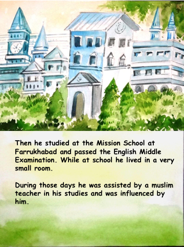 Then he studied at the Mission School at Farrukhabad and passed the English Middle Examination. While at school he lived in a very small room. During those days he was assisted by a muslim teacher in his studies and was influenced by him.