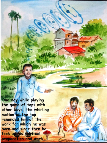 One day while playing the game of tops with other boys, the whirling motion of the top reminded him of the work for which he was born and since then he took up his spiritual preparation and work.