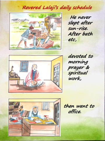 Revered Lalaji’s daily schedule He never slept after sun - rise. After bath etc , devoted to morning prayer & spiritual work, t hen went to office.