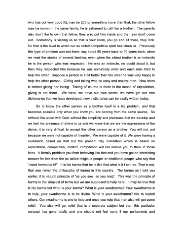 So to know the other person as a brother itself is a big problem, and that becomes possible only when you know you are coming from the same source. So without this union with God, without the simplicity and plainness that we develop and we feel the presence of divine in us and we know that we are the expressions of the divine, it is very difficult to accept the other person as a brother. You will not, not because we were not capable of it earlier. We were capable of it. We were having a civilisation based on that but the present day civilisation which is based on exploitation, competition, conflict, comparison will not enable you to think in those lines. It literally prohibits you from behaving like that and you have got an interesting answer for this from the so called religious people or traditional people who say that “vaadi karmandi idi”. It is his karma that he is like that what is it I can do. That is not, that was never the philosophy of karma in this country. The karma as I told you earlier, it is natural principle of “as you sow, so you reap”. This was the principle of karma in the simplest of terms but we are supposed to help here. It may be true that is his karma but what is your karma? What is your swadharma? Your swadharma is to help, your swadharma is to be divine. What is your swadharma? Not to exploit others. Our swadharma is one to help and once you help that man also will get some relief. You also will get relief that is a separate subject but then this particular concept has gone totally and one should not feel sorry if our parliaments and