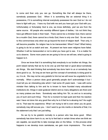 to come and then only you can go. Something like that will always be there, somebody possesses God. When it is something like an external thing it is possessive, if it is something internal everybody possesses his own God so I do not have to fight with you. I have my God with me and you have got your God with you. Unfortunately or fortunately God is one, we know definitely, yes! we are from the same source. All people who worship different types of deities, I do not think they have got different Gods in their heart. There cannot be a christian God, there cannot be a muslim God, there cannot be a hindu God, there is only one God. So we come to this commonness only when we go beyond the level of religion itself. Then only, it will become possible. So religion has to be transcended. When? How? What history is going to do let us watch and see. At present we have seen religions have failed. Whether it will be transcended or not is what you have got to see. It is a matter for us to observe. Some more years we are going to live so we will see, what is going to happen to it.