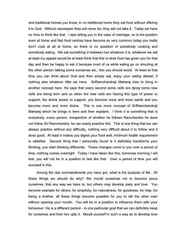 and traditional homes you know; in no traditional home they eat food without offering it to God. Without naivedyam they will never do; they will not take it. Today we have no time to think like that. I was telling you in the case of marriage, so is the position even at home and fast food centres have become so very common today you really don't cook at all at home, so there is no question of somebody cooking and somebody eating. We eat something in between but whatever it is, whatever we eat at least my appeal would be at least think that this is what God has given you for that day and then be happy to eat it because most of us while eating go on shouting at the other person talking some nonsense etc., this you should avoid. At least at that time you can think about God and then simply eat, enjoy your eating atleast, if nothing else whatever little we have. SriRamchandraji Maharaj tries to bring in another concept here. He says that every second some cells are dying some new cells are being born and so when the new cells are having this type of power to support, the divine power to support, you become more and more satvik and you become more and more divine. This is one more concept of SriRamchandraji Maharaj which he brings in here and then explains. I think it is something that is everybody, every person, irrespective of whether he follows Ramchandra he does not follow Sri Ramchandra, he can easily practice this. This is one thing that we can always practice without any difficulty, nothing very difficult about it to follow and it does good. At least it makes you digest your food well, minimum health requirement is satisfied. Second thing that I personally found is it definitely transforms your thinking, you start thinking differently. These changes come to you over a period of time, nothing comes overnight. Today I have taken like this, tomorrow morning I will test, you will not be in a position to test like that. Over a period of time you will succeed in this.
