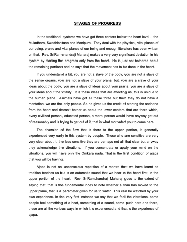 In the traditional systems we have got three centers below the heart level - the Muladhara, Swadhishtana and Manipura. They deal with the physical, vital planes of our being, pranic and vital planes of our being and enough literature has been written on that. Rev. SriRamchandraji Maharaj makes a very very significant deviation in his system by starting the progress only from the heart. He is just not bothered about the remaining portions and he says that the movement has to be done in the heart.