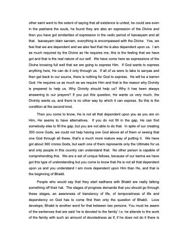 other saint went to the extent of saying that all existence is united, he could see even in the pashana the souls, he found they are also an expression of the Divine and then you have got similarities of expression in the vedic period of Isavasyam and all that. Isavasyam idam sarvam, everything is encompassed with the Divine. Yes, we feel that we are dependent and we also feel that He is also dependent upon us. I am as much required by the Divine as He requires me, this is the feeling that we have got and that is the real nature of our self. We have come here as expressions of the Divine knowing full well that we are going to express Him. If God wants to express anything here, He can do it only through us. If all of us were to take to sanyas and then get back to our source, there is nothing for God to express. He will be a barren God. He requires us as much as we require Him and that is the reason why Divinity is prepared to help us. Why Divinity should help us? Why it has been always answering to our prayers? If you put this question, He wants us very much, the Divinity wants us, and there is no other way by which it can express. So this is the condition at the second knot.