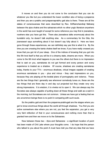 It moves on and then you do not come to the conclusion that you can do whatever you like but you understand the lower condition also of being a prapanna and then you are a prabhu and prapannaprabhu gati also is there. These are all the states of consciousness that were described by Rev. SriRamchandraji Maharaj between the ajna chakra and the sahasrara which no other yogic literature anywhere in the world has ever taught of except for some reference you may find in jnanadeva, nowhere else you have got this. There also jnanadeva talks enormously about the kundalini only, he doesn’t talk anything else. As a commentary for the Gita, the jnaneswari says something about it but doesn’t say fully about it. Here we have gone through these experiences, we can definitely say yes this is what it is. By the time you are crossing the kanta chakra itself we know, if you have really crossed you know that you got rid of your sleep. One of the indices of knowing that you got into this 5th knot itself is that you will be in a dreamy state, dreams are more. When you come to the 6th knot what happens is you see the others but there is no impression that is cast on you, samskaras do not get formed and every person and every experience is treated as a shadow. Of course, shadows are creating samskaras today, thanks to your TV’s - enormous shadows, virtual images capable of creating enormous samskaras in you - plus and minus - they cast impressions on you, because they are playing at the bestial plane of pornography and violence. These are the two things that I generally see whenever somebody tunes on, these are the two things that are there day in and day out projected but they create very very strong impressions. It is wisdom, it is viveka not to open it. We can always say the Socrates was always capable of putting down all these things and walk as a saint in the morning, but Socrateses are not common. Unless we have got a feeling that we are uncommon beings there is no point in comparing with such souls.