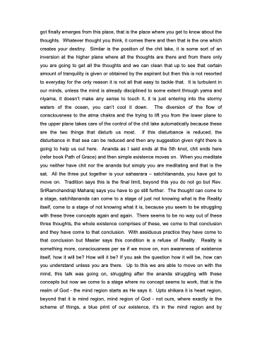 got finally emerges from this place, that is the place where you get to know about the thoughts. Whatever thought you think, it comes there and then that is the one which creates your destiny. Similar is the position of the chit lake, it is some sort of an inversion at the higher plane where all the thoughts are there and from there only you are going to get all the thoughts and we can clean that up to see that certain amount of tranquility is given or obtained by the aspirant but then this is not resorted to everyday for the only reason it is not all that easy to tackle that. It is turbulent in our minds, unless the mind is already disciplined to some extent through yama and niyama, it doesn’t make any sense to touch it, it is just entering into the stormy waters of the ocean, you can’t cool it down. The diversion of the flow of consciousness to the atma chakra and the trying to lift you from the lower plane to the upper plane takes care of the control of the chit lake automatically because these are the two things that disturb us most. If this disturbance is reduced, the disturbance in that sea can be reduced and then any suggestion given right there is going to help us out here. Ananda as I said ends at the 5th knot, chit ends here (refer book Path of Grace) and then simple existence moves on. When you meditate you neither have chit nor the ananda but simply you are meditating and that is the sat. All the three put together is your sahasrara – satchitananda, you have got to move on. Tradition says this is the final limit, beyond this you do not go but Rev. SriRamchandraji Maharaj says you have to go still further. The thought can come to a stage, satchitananda can come to a stage of just not knowing what is the Reality itself, come to a stage of not knowing what it is, because you seem to be struggling with these three concepts again and again. There seems to be no way out of these three thoughts, the whole existence comprises of these, we come to that conclusion and they have come to that conclusion. With assiduous practice they have come to that conclusion but Master says this condition is a refuse of Reality. Reality is something more, consciousness per se if we move on, non awareness of existence itself, how it will be? How will it be? If you ask the question how it will be, how can you understand unless you are there. Up to this we are able to move on with the mind, this talk was going on, struggling after the ananda struggling with these concepts but now we come to a stage where no concept seems to work, that is the realm of God - the mind region starts as He says it. Upto shikara it is heart region, beyond that it is mind region, mind region of God - not ours, where exactly is the scheme of things, a blue print of our existence, it’s in the mind region and by