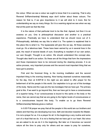 the colour. When we see a colour we ought to know that it is a warning. That is why Revered SriRamchandraji Maharaj says don't bother about these colours. The reason for that is, if we give importance to it we will stick to it more. But for understanding we say so many things. So it is a warning signal we see when we say that at this point we feel like that.