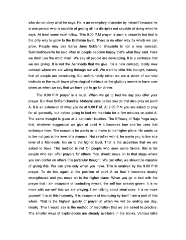 who do not obey what he says. He is an exemplary character by himself because he is one person who is capable of getting all his disciples not capable of doing what he says. At least some must follow. This 9.00 P.M prayer is such a casuality but that is the only way to grow to the Brahman level. There is no other way by which we can grow. People may say Sarve Jana Sukhino Bhavantu is not a new concept, Sukhinobhavantu he said. May all people become happy that's what they said. Here we don't use the word 'may'. We say all people are developing. It is a sankalpa that we are giving. It is not the Ashirvada that we give. It's a new concept, totally new concept where we are willing through our will. We want to offer this thought, namely that all people are developing. But unfortunately either we are a victim of our vital instincts or the much lower physiological instincts or the gluttony seems to have over taken us when we say that we have got to go for dinner.