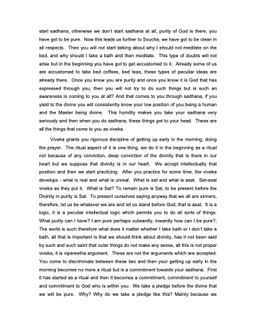 Viveka grants you rigorous discipline of getting up early in the morning, doing the prayer. The ritual aspect of it is one thing, we do it in the beginning as a ritual not because of any conviction, deep conviction of the divinity that is there in our heart but we suppose that divinity is in our heart. We accept intellectually that position and then we start practicing. After you practice for some time, the viveka develops - what is real and what is unreal. What is sat and what is asat. Sat-asat viveka as they put it. What is Sat? To remain pure is Sat, to be present before the Divinity in purity is Sat. To present ourselves saying anyway that we all are sinners, therefore, let us be whatever we are and let us stand before God, that is asat. It is a logic, it is a peculiar intellectual logic which permits you to do all sorts of things. What purity can I have? I am pure perhaps outwardly, inwardly how can I be pure?, The world is such therefore what does it matter whether I take bath or I don’t take a bath, all that is important is that we should think about divinity, has it not been said by such and such saint that outer things do not make any sense, all this is not proper viveka, it is vipareetha argument. These are not the arguments which are accepted. You come to discriminate between these two and then your getting up early in the morning becomes no more a ritual but is a commitment towards your sadhana. First it has started as a ritual and then it becomes a commitment, commitment to yourself and commitment to God who is within you. We take a pledge before the divine that we will be pure. Why? Why do we take a pledge like this? Mainly because we