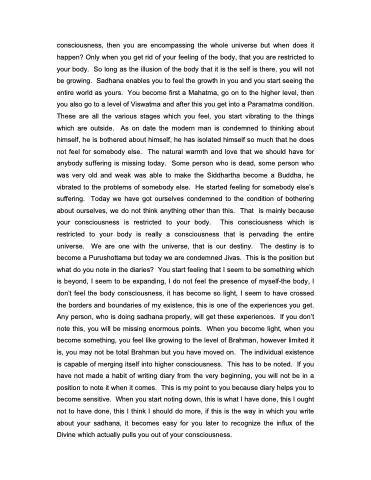 consciousness, then you are encompassing the whole universe but when does it happen? Only when you get rid of your feeling of the body, that you are restricted to your body. So long as the illusion of the body that it is the self is there, you will not be growing. Sadhana enables you to feel the growth in you and you start seeing the entire world as yours. You become first a Mahatma, go on to the higher level, then you also go to a level of Viswatma and after this you get into a Paramatma condition. These are all the various stages which you feel, you start vibrating to the things which are outside. As on date the modern man is condemned to thinking about himself, he is bothered about himself, he has isolated himself so much that he does not feel for somebody else. The natural warmth and love that we should have for anybody suffering is missing today. Some person who is dead, some person who was very old and weak was able to make the Siddhartha become a Buddha, he vibrated to the problems of somebody else. He started feeling for somebody else’s suffering. Today we have got ourselves condemned to the condition of bothering about ourselves, we do not think anything other than this. That is mainly because your consciousness is restricted to your body. This consciousness which is restricted to your body is really a consciousness that is pervading the entire universe. We are one with the universe, that is our destiny. The destiny is to become a Purushottama but today we are condemned Jivas. This is the position but what do you note in the diaries? You start feeling that I seem to be something which is beyond, I seem to be expanding, I do not feel the presence of myself-the body, I don’t feel the body consciousness, it has become so light, I seem to have crossed the borders and boundaries of my existence, this is one of the experiences you get. Any person, who is doing sadhana properly, will get these experiences. If you don’t note this, you will be missing enormous points. When you become light, when you become something, you feel like growing to the level of Brahman, however limited it is, you may not be total Brahman but you have moved on. The individual existence is capable of merging itself into higher consciousness. This has to be noted. If you have not made a habit of writing diary from the very beginning, you will not be in a position to note it when it comes. This is my point to you because diary helps you to become sensitive. When you start noting down, this is what I have done, this I ought not to have done, this I think I should do more, if this is the way in which you write about your sadhana, it becomes easy for you later to recognize the influx of the Divine which actually pulls you out of your consciousness.
