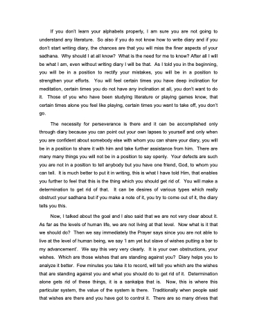 The necessity for perseverance is there and it can be accomplished only through diary because you can point out your own lapses to yourself and only when you are confident about somebody else with whom you can share your diary, you will be in a position to share it with him and take further assistance from him. There are many many things you will not be in a position to say openly. Your defects are such you are not in a position to tell anybody but you have one friend, God, to whom you can tell. It is much better to put it in writing, this is what I have told Him, that enables you further to feel that this is the thing which you should get rid of. You will make a determination to get rid of that. It can be desires of various types which really obstruct your sadhana but if you make a note of it, you try to come out of it, the diary tells you this.