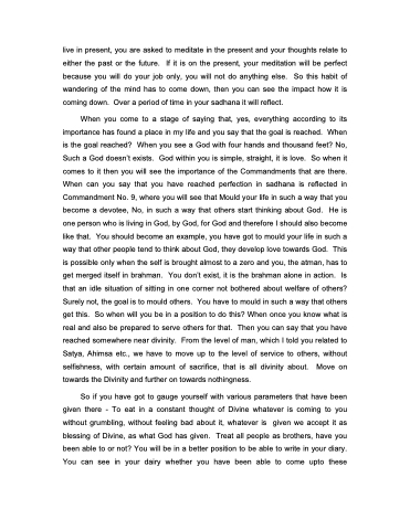 When you come to a stage of saying that, yes, everything according to its importance has found a place in my life and you say that the goal is reached. When is the goal reached? When you see a God with four hands and thousand feet? No, Such a God doesn’t exists. God within you is simple, straight, it is love. So when it comes to it then you will see the importance of the Commandments that are there. When can you say that you have reached perfection in sadhana is reflected in Commandment No. 9, where you will see that Mould your life in such a way that you become a devotee, No, in such a way that others start thinking about God. He is one person who is living in God, by God, for God and therefore I should also become like that. You should become an example, you have got to mould your life in such a way that other people tend to think about God, they develop love towards God. This is possible only when the self is brought almost to a zero and you, the atman, has to get merged itself in brahman. You don’t exist, it is the brahman alone in action. Is that an idle situation of sitting in one corner not bothered about welfare of others? Surely not, the goal is to mould others. You have to mould in such a way that others get this. So when will you be in a position to do this? When once you know what is real and also be prepared to serve others for that. Then you can say that you have reached somewhere near divinity. From the level of man, which I told you related to Satya, Ahimsa etc., we have to move up to the level of service to others, without selfishness, with certain amount of sacrifice, that is all divinity about. Move on towards the Divinity and further on towards nothingness.