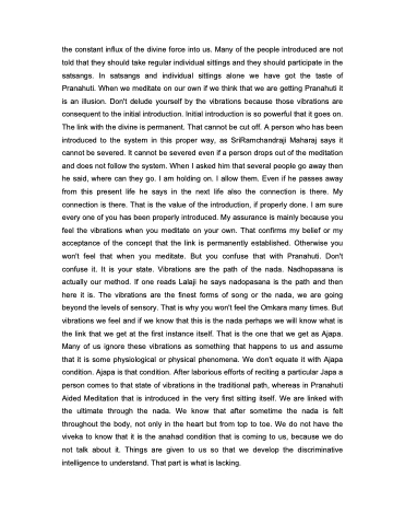 the constant influx of the divine force into us. Many of the people introduced are not told that they should take regular individual sittings and they should participate in the satsangs. In satsangs and individual sittings alone we have got the taste of Pranahuti. When we meditate on our own if we think that we are getting Pranahuti it is an illusion. Don't delude yourself by the vibrations because those vibrations are consequent to the initial introduction. Initial introduction is so powerful that it goes on. The link with the divine is permanent. That cannot be cut off. A person who has been introduced to the system in this proper way, as SriRamchandraji Maharaj says it cannot be severed. It cannot be severed even if a person drops out of the meditation and does not follow the system. When I asked him that several people go away then he said, where can they go. I am holding on. I allow them. Even if he passes away from this present life he says in the next life also the connection is there. My connection is there. That is the value of the introduction, if properly done. I am sure every one of you has been properly introduced. My assurance is mainly because you feel the vibrations when you meditate on your own. That confirms my belief or my acceptance of the concept that the link is permanently established. Otherwise you won't feel that when you meditate. But you confuse that with Pranahuti. Don't confuse it. It is your state. Vibrations are the path of the nada. Nadhopasana is actually our method. If one reads Lalaji he says nadopasana is the path and then here it is. The vibrations are the finest forms of song or the nada, we are going beyond the levels of sensory. That is why you won't feel the Omkara many times. But vibrations we feel and if we know that this is the nada perhaps we will know what is the link that we get at the first instance itself. That is the one that we get as Ajapa. Many of us ignore these vibrations as something that happens to us and assume that it is some physiological or physical phenomena. We don't equate it with Ajapa condition. Ajapa is that condition. After laborious efforts of reciting a particular Japa a person comes to that state of vibrations in the traditional path, whereas in Pranahuti Aided Meditation that is introduced in the very first sitting itself. We are linked with the ultimate through the nada. We know that after sometime the nada is felt throughout the body, not only in the heart but from top to toe. We do not have the viveka to know that it is the anahad condition that is coming to us, because we do not talk about it. Things are given to us so that we develop the discriminative intelligence to understand. That part is what is lacking.