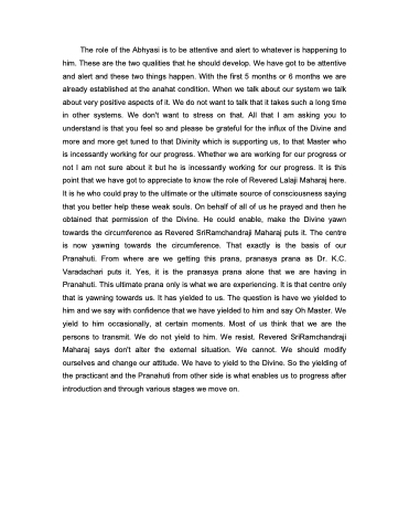 The role of the Abhyasi is to be attentive and alert to whatever is happening to him. These are the two qualities that he should develop. We have got to be attentive and alert and these two things happen. With the first 5 months or 6 months we are already established at the anahat condition. When we talk about our system we talk about very positive aspects of it. We do not want to talk that it takes such a long time in other systems. We don't want to stress on that. All that I am asking you to understand is that you feel so and please be grateful for the influx of the Divine and more and more get tuned to that Divinity which is supporting us, to that Master who is incessantly working for our progress. Whether we are working for our progress or not I am not sure about it but he is incessantly working for our progress. It is this point that we have got to appreciate to know the role of Revered Lalaji Maharaj here. It is he who could pray to the ultimate or the ultimate source of consciousness saying that you better help these weak souls. On behalf of all of us he prayed and then he obtained that permission of the Divine. He could enable, make the Divine yawn towards the circumference as Revered SriRamchandraji Maharaj puts it. The centre is now yawning towards the circumference. That exactly is the basis of our Pranahuti. From where are we getting this prana, pranasya prana as Dr. K.C. Varadachari puts it. Yes, it is the pranasya prana alone that we are having in Pranahuti. This ultimate prana only is what we are experiencing. It is that centre only that is yawning towards us. It has yielded to us. The question is have we yielded to him and we say with confidence that we have yielded to him and say Oh Master. We yield to him occasionally, at certain moments. Most of us think that we are the persons to transmit. We do not yield to him. We resist. Revered SriRamchandraji Maharaj says don't alter the external situation. We cannot. We should modify ourselves and change our attitude. We have to yield to the Divine. So the yielding of the practicant and the Pranahuti from other side is what enables us to progress after introduction and through various stages we move on.