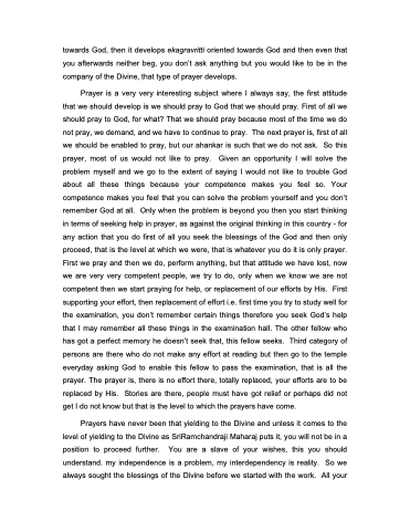 Prayer is a very very interesting subject where I always say, the first attitude that we should develop is we should pray to God that we should pray. First of all we should pray to God, for what? That we should pray because most of the time we do not pray, we demand, and we have to continue to pray. The next prayer is, first of all we should be enabled to pray, but our ahankar is such that we do not ask. So this prayer, most of us would not like to pray. Given an opportunity I will solve the problem myself and we go to the extent of saying I would not like to trouble God about all these things because your competence makes you feel so. Your competence makes you feel that you can solve the problem yourself and you don’t remember God at all. Only when the problem is beyond you then you start thinking in terms of seeking help in prayer, as against the original thinking in this country - for any action that you do first of all you seek the blessings of the God and then only proceed, that is the level at which we were, that is whatever you do it is only prayer. First we pray and then we do, perform anything, but that attitude we have lost, now we are very very competent people, we try to do, only when we know we are not competent then we start praying for help, or replacement of our efforts by His. First supporting your effort, then replacement of effort i.e. first time you try to study well for the examination, you don’t remember certain things therefore you seek God’s help that I may remember all these things in the examination hall. The other fellow who has got a perfect memory he doesn’t seek that, this fellow seeks. Third category of persons are there who do not make any effort at reading but then go to the temple everyday asking God to enable this fellow to pass the examination, that is all the prayer. The prayer is, there is no effort there, totally replaced, your efforts are to be replaced by His. Stories are there, people must have got relief or perhaps did not get I do not know but that is the level to which the prayers have come.