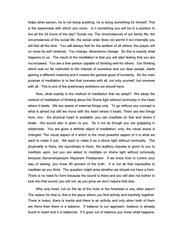 helps other person, he is not doing anything, he is doing something for himself. This is the awareness with which you move. Is it something you will be in a position to live all the 24 hours of the day? Surely not. The circumstances of our family life, the circumstances of the social life, the social order does not permit it but internally you will feel all the time. You will always feel for the welfare of all others, the prayer will no more be self centered. You change, dimensions change. So this is exactly what happens to us. The result of the meditation is that you will start feeling that you are not encased. You are a free person capable of thinking well for others. Our thinking which was so far restricted to the interest of ourselves and our dear people, starts gaining a different meaning and it means the general good of humanity. So the main purpose of meditation is to feel that oneness with all, not only yourself, but oneness with all. This is one of the preliminary ambitions we should have.