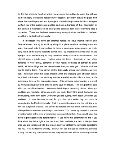 So it is that particular heart on which you are going to meditate because that will give us the capacity to balance between two opposites. Secondly, that is the place from where the blood is pumped and if you get a purified thought there the blood also gets purified, the entire system gets purified and gets advantage of that. Meditation on that point is a meditation on all other points because from there everything else is connected. These are the basic reasons why we say that we meditate on the heart on a Divine light without luminosity.