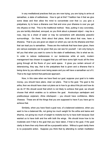 Similarly, when you have fixed a goal now, of a balanced existence, when you want to live a balanced life, not giving too much weight for the artha and kama and dharma, not giving too much of weight to moksha but try to have both because God wanted us to have both and live with both the wings. We should know how to be moderate and if that is the goal that you have taken, if that is the goal, if the goal clarity is there then only there will be a purposeful action. Without a goal clarity there is no purposeful action. Suppose you think that by attending to certain meditation