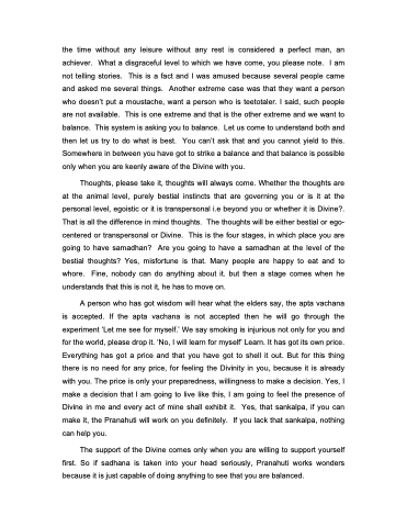 the time without any leisure without any rest is considered a perfect man, an achiever. What a disgraceful level to which we have come, you please note. I am not telling stories. This is a fact and I was amused because several people came and asked me several things. Another extreme case was that they want a person who doesn’t put a moustache, want a person who is teetotaler. I said, such people are not available. This is one extreme and that is the other extreme and we want to balance. This system is asking you to balance. Let us come to understand both and then let us try to do what is best. You can’t ask that and you cannot yield to this. Somewhere in between you have got to strike a balance and that balance is possible only when you are keenly aware of the Divine with you.