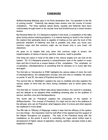 My Revered father Sri. K.C.Narayana explains in this book, a compilation of the talks given during various training programs, in a manner leaving no doubt in the minds of the readers that spirituality alone is capable of making us live upto the level of this particular standard of fraternity and that is possible only when you know your common origin and this common origin can be known only in your heart, not elsewhere.
