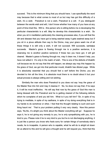 succeed. This is the minimum thing that you should have. I use specifically the word may because that is what comes to most of us but may has got this difficulty of a wish, it’s a wish. Pranahuti is not a wish, Pranahuti is a will. If you distinguish between the words wish and will, I don’t know whether how many of you have at any point of time tried this. Will is - this person who is sitting before me is developing this particular characteristic is a will. May he develop this characteristic is a wish. So when you sit in meditation particularly the cleaning processes also, if you will that the dirt and disease that you have got is being washed away it gets washed away but if you sit in a pious attitude then say to the Divine, may your grace wash me of all these things it is still only a wish, it will not succeed. Will succeeds, sankalpa succeeds. Master’s grace is flowing through me is a positive sentence, it is cleansing me is another positive sentence if these two you have got, it will get cleared. Master’s grace is flowing through me, may it clean me, it doesn’t help, you have not willed it. It’s only in the realm of wish. This is one of the defects of bhakthi cult because we do not say that this will happen, we always say may this happen by the grace of God, we got into that particular mould, bhakthi has diluted yoga. While it is absolutely essential that you should feel a serf before the Divine, you are devoted to him all the time, it is absolute must there is no doubt about it but your actual process is always willing and not wishing.