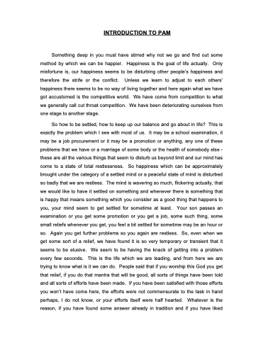 So how to be settled, how to keep up our balance and go about in life? This is exactly the problem which I see with most of us. It may be a school examination, it may be a job procurement or it may be a promotion or anything, any one of these problems that we have or a marriage of some body or the health of somebody else - these are all the various things that seem to disturb us beyond limit and our mind has come to a state of total restlessness. So happiness which can be approximately brought under the category of a settled mind or a peaceful state of mind is disturbed so badly that we are restless. The mind is wavering so much, flickering actually, that we would like to have it settled on something and whenever there is something that is happy that means something which you consider as a good thing that happens to you, your mind seem to get settled for sometime at least. Your son passes an examination or you get some promotion or you get a job, some such thing, some small reliefs whenever you get, you feel a bit settled for sometime may be an hour or so. Again you get further problems so you again are restless. So, even when we get some sort of a relief, we have found it is so very temporary or transient that it seems to be elusive. We seem to be having the knack of getting into a problem every few seconds. This is the life which we are leading, and from here we are trying to know what is it we can do. People said that if you worship this God you get that relief, if you do that mantra that will be good, all sorts of things have been told and all sorts of efforts have been made. If you have been satisfied with those efforts you won’t have come here, the efforts were not commensurate to the task in hand perhaps, I do not know, or your efforts itself were half hearted. Whatever is the reason, if you have found some answer already in tradition and if you have liked