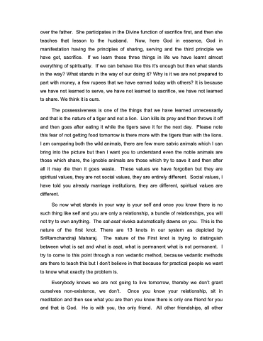 over the father. She participates in the Divine function of sacrifice first, and then she teaches that lesson to the husband. Now, here God in essence, God in manifestation having the principles of sharing, serving and the third principle we have got, sacrifice. If we learn these three things in life we have learnt almost everything of spirituality. If we can behave like this it’s enough but then what stands in the way? What stands in the way of our doing it? Why is it we are not prepared to part with money, a few rupees that we have earned today with others? It is because we have not learned to serve, we have not learned to sacrifice, we have not learned to share. We think it is ours.