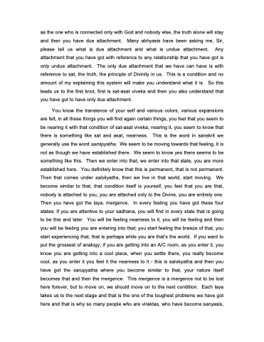 You know the transience of your self and various colors, various expansions are felt, in all these things you will find again certain things, you feel that you seem to be nearing it with that condition of sat-asat viveka, nearing it, you seem to know that there is something like sat and asat, nearness. This is the word in sanskrit we generally use the word samipyatha. We seem to be moving towards that feeling, it is not as though we have established there. We seem to know yes there seems to be something like this. Then we enter into that, we enter into that state, you are more established here. You definitely know that this is permanent, that is not permanent. Then that comes under salokyatha, then we live in that world, start moving. We become similar to that, that condition itself is yourself, you feel that you are that, nobody is attached to you, you are attached only to the Divine, you are entirely one. Then you have got the laya, mergence. In every feeling you have got these four states; If you are attentive to your sadhana, you will find in every state that is going to be this and later. You will be feeling nearness to it, you will be feeling and then you will be feeling you are entering into that; you start feeling the breeze of that, you start experiencing that, that is perhaps while you are that’s the world. If you want to put the grossest of analogy; if you are getting into an A/C room, as you enter it, you know you are getting into a cool place, when you settle there, you really become cool, as you enter it you feel it the nearness to it - this is salokyatha and then you have got the sarupyatha where you become similar to that, your nature itself becomes that and then the mergence. This mergence is a mergence not to be lost here forever, but to move on, we should move on to the next condition. Each laya takes us to the next stage and that is the one of the toughest problems we have got here and that is why so many people who are viraktas, who have become sanyasis,
