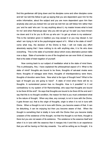 Now coming back to our subject of meditation what is the state of mind there. This is philosophy, fine, I have explained the philosophical aspect of it. What is the state of mind? thoughts are bound to be there, thoughts of sat-asat viveka were there; thoughts of vairagya were there, thoughts of interdependency were there, thoughts of devotion were there. Now what is the type of thought here? What is the type of thought you are going to have? A state of mind when there will be no thoughts. A surrendered person has no thoughts. How is it possible? Is it not contradictory to my system of Sri Ramchandraji, who says that thoughts are bound to be there till the end? He says that thoughts are bound to be there till the end and I say that this is no thought condition, the reason for that is you must understand what is the nature of thought. When any idea, any concept, is not in tune with the Divine, it gets thrown out, that is the origin of thoughts, origin is when it is not in tune with Divine. When a thought is not in tune with Divine, you become aware of that. It can be disturbing, it can be enjoying but then you become aware of that. When the thought is something that is totally in tune with the Divine then you become totally unaware of the existence of the thought, not that the thought is not there, thought is there but you are not aware of its existence. The existence is the essence itself and when it is in tune with the essence then it merges into it and this is an experience that you will be having on first day onwards. You will be writing as no thought, it is
