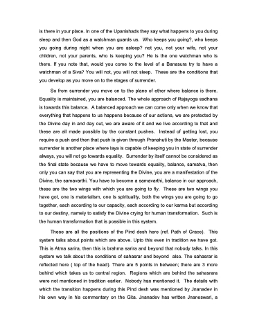 So from surrender you move on to the plane of ether where balance is there. Equality is maintained, you are balanced. The whole approach of Rajayoga sadhana is towards this balance. A balanced approach we can come only when we know that everything that happens to us happens because of our actions, we are protected by the Divine day in and day out, we are aware of it and we live according to that and these are all made possible by the constant pushes. Instead of getting lost, you require a push and then that push is given through Pranahuti by the Master, because surrender is another place where laya is capable of keeping you in state of surrender always, you will not go towards equality. Surrender by itself cannot be considered as the final state because we have to move towards equality, balance, samatva, then only you can say that you are representing the Divine, you are a manifestation of the Divine, the samavarthi. You have to become a samavarthi, balance in our approach, these are the two wings with which you are going to fly. These are two wings you have got, one is materialism, one is spirituality, both the wings you are going to go together, each according to our capacity, each according to our karma but according to our destiny, namely to satisfy the Divine crying for human transformation. Such is the human transformation that is possible in this system.