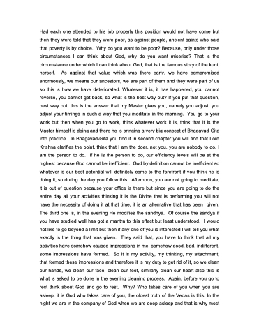 Had each one attended to his job properly this position would not have come but then they were told that they were poor, as against people, ancient saints who said that poverty is by choice. Why do you want to be poor? Because, only under those circumstances I can think about God, why do you want miseries? That is the circumstance under which I can think about God, that is the famous story of the kunti herself. As against that value which was there early, we have compromised enormously, we means our ancestors, we are part of them and they were part of us so this is how we have deteriorated. Whatever it is, it has happened, you cannot reverse, you cannot get back, so what is the best way out? If you put that question, best way out, this is the answer that my Master gives you, namely you adjust, you adjust your timings in such a way that you meditate in the morning. You go to your work but then when you go to work, think whatever work it is, think that it is the Master himself is doing and there he is bringing a very big concept of Bhagavad-Gita into practice. In Bhagavad-Gita you find it in second chapter you will find that Lord Krishna clarifies the point, think that I am the doer, not you, you are nobody to do, I am the person to do. If he is the person to do, our efficiency levels will be at the highest because God cannot be inefficient. God by definition cannot be inefficient so whatever is our best potential will definitely come to the forefront if you think he is doing it, so during the day you follow this. Afternoon, you are not going to meditate, it is out of question because your office is there but since you are going to do the entire day all your activities thinking it is the Divine that is performing you will not have the necessity of doing it at that time, it is an alternative that has been given. The third one is, in the evening He modifies the sandhya. Of course the sandya if you have studied well has got a mantra to this effect but least understood. I would not like to go beyond a limit but then if any one of you is interested I will tell you what exactly is the thing that was given. They said that, you have to think that all my activities have somehow caused impressions in me, somehow good, bad, indifferent, some impressions have formed. So it is my activity, my thinking, my attachment, that formed these impressions and therefore it is my duty to get rid of it, so we clean our hands, we clean our face, clean our feet, similarly clean our heart also this is what is asked to be done in the evening cleaning process. Again, before you go to rest think about God and go to rest. Why? Who takes care of you when you are asleep, it is God who takes care of you, the oldest truth of the Vedas is this. In the night we are in the company of God when we are deep asleep and that is why most
