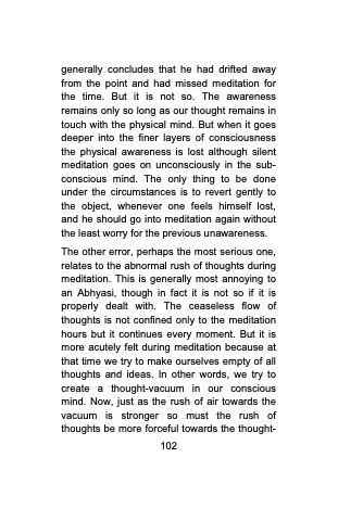 generally concludes that he had drifted away from the point and had missed meditation for the time. But it is not so. The awareness remains only so long as our thought remains in touch with the physical mind. But when it goes deeper into the finer layers of consciousness the physical awareness is lost although silent meditation goes on unconsciously in the sub- conscious mind. The only thing to be done under the circumstances is to revert gently to the object, whenever one feels himself lost, and he should go into meditation again without the least worry for the previous unawareness.