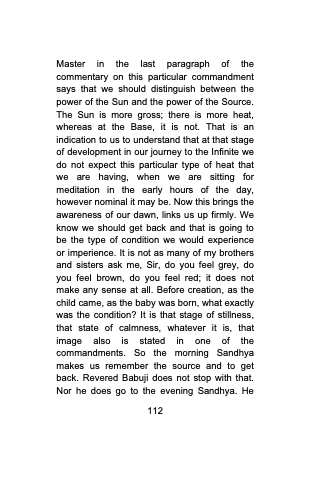 Master in the last paragraph of the commentary on this particular commandment says that we should distinguish between the power of the Sun and the power of the Source. The Sun is more gross; there is more heat, whereas at the Base, it is not. That is an indication to us to understand that at that stage of development in our journey to the Infinite we do not expect this particular type of heat that we are having, when we are sitting for meditation in the early hours of the day, however nominal it may be. Now this brings the awareness of our dawn, links us up firmly. We know we should get back and that is going to be the type of condition we would experience or imperience. It is not as many of my brothers and sisters ask me, Sir, do you feel grey, do you feel brown, do you feel red; it does not make any sense at all. Before creation, as the child came, as the baby was born, what exactly was the condition? It is that stage of stillness, that state of calmness, whatever it is, that image also is stated in one of the commandments. So the morning Sandhya makes us remember the source and to get back. Revered Babuji does not stop with that. Nor he does go to the evening Sandhya. He
