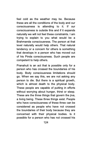 feel cold as the weather may be. Because these are all the conditions of the body and our consciousness is attending to it. If our consciousness is outside this and if it expands naturally we will not feel these constraints. I am trying to explain to you what would be a Brahmanda consciousness. The person at that level naturally would help others. That natural tendency or a concern for others is something that develops in a person who has moved out of his Pinda consciousness. Such people are competent to help others.