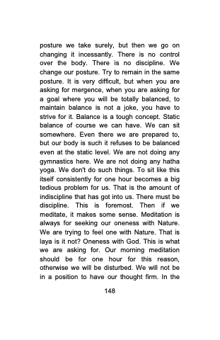 posture we take surely, but then we go on changing it incessantly. There is no control over the body. There is no discipline. We change our posture. Try to remain in the same posture. It is very difficult, but when you are asking for mergence, when you are asking for a goal where you will be totally balanced, to maintain balance is not a joke, you have to strive for it. Balance is a tough concept. Static balance of course we can have. We can sit somewhere. Even there we are prepared to, but our body is such it refuses to be balanced even at the static level. We are not doing any gymnastics here. We are not doing any hatha yoga. We don't do such things. To sit like this itself consistently for one hour becomes a big tedious problem for us. That is the amount of indiscipline that has got into us. There must be discipline. This is foremost. Then if we meditate, it makes some sense. Meditation is always for seeking our oneness with Nature. We are trying to feel one with Nature. That is laya is it not? Oneness with God. This is what we are asking for. Our morning meditation should be for one hour for this reason, otherwise we will be disturbed. We will not be in a position to have our thought firm. In the