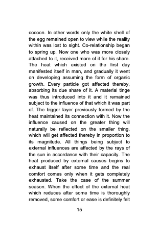cocoon. In other words only the white shell of the egg remained open to view while the reality within was lost to sight. Co-relationship began to spring up. Now one who was more closely attached to it, received more of it for his share. The heat which existed on the first day manifested itself in man, and gradually it went on developing assuming the form of organic growth. Every particle got affected thereby, absorbing its due share of it. A material tinge was thus introduced into it and it remained subject to the influence of that which it was part of. The bigger layer previously formed by the heat maintained its connection with it. Now the influence caused on the greater thing will naturally be reflected on the smaller thing, which will get affected thereby in proportion to its magnitude. All things being subject to external influences are affected by the rays of the sun in accordance with their capacity. The heat produced by external causes begins to exhaust itself after some time and the real comfort comes only when it gets completely exhausted. Take the case of the summer season. When the effect of the external heat which reduces after some time is thoroughly removed, some comfort or ease is definitely felt