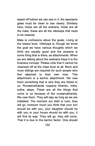 Mala is confusions about the goals. Living at the lowest level. Vikshepa is, though we know the goal we have various thoughts which we think are equally good and the avarana is some thing that is there, as attachments. When we are talking about the eeshana traya it is the Avarana concept. Please note that it cannot be cleansed off at the mala level at all. More and more sittings are required for such people who feel attached to their own men. This attachment is a karmic attachment. We owe them something that is why they are linked to us. Runaanubhanda ruupena bhandu, mitra, sutha, alaya. These are all the things that come to us because of the runaanubhanda. We owe them. They will stay as long as we are indebted. The moment our debt is over, they will go, however much you think that your son should be with you, your daughter should be with you or your house should be with you, it will find its way. They will go, they will come. That it is due to the karmic factor. One should