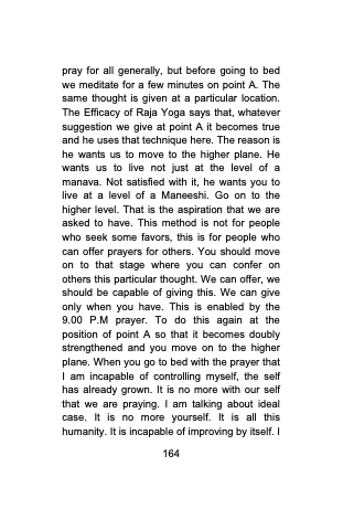 pray for all generally, but before going to bed we meditate for a few minutes on point A. The same thought is given at a particular location. The Efficacy of Raja Yoga says that, whatever suggestion we give at point A it becomes true and he uses that technique here. The reason is he wants us to move to the higher plane. He wants us to live not just at the level of a manava. Not satisfied with it, he wants you to live at a level of a Maneeshi. Go on to the higher level. That is the aspiration that we are asked to have. This method is not for people who seek some favors, this is for people who can offer prayers for others. You should move on to that stage where you can confer on others this particular thought. We can offer, we should be capable of giving this. We can give only when you have. This is enabled by the 9.00 P.M prayer. To do this again at the position of point A so that it becomes doubly strengthened and you move on to the higher plane. When you go to bed with the prayer that I am incapable of controlling myself, the self has already grown. It is no more with our self that we are praying. I am talking about ideal case. It is no more yourself. It is all this humanity. It is incapable of improving by itself. I