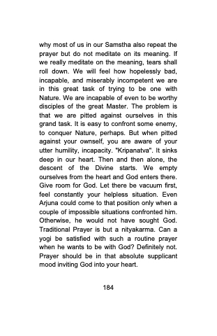 why most of us in our Samstha also repeat the prayer but do not meditate on its meaning. If we really meditate on the meaning, tears shall roll down. We will feel how hopelessly bad, incapable, and miserably incompetent we are in this great task of trying to be one with Nature. We are incapable of even to be worthy disciples of the great Master. The problem is that we are pitted against ourselves in this grand task. It is easy to confront some enemy, to conquer Nature, perhaps. But when pitted against your ownself, you are aware of your utter humility, incapacity. "Kripanatva". It sinks deep in our heart. Then and then alone, the descent of the Divine starts. We empty ourselves from the heart and God enters there. Give room for God. Let there be vacuum first, feel constantly your helpless situation. Even Arjuna could come to that position only when a couple of impossible situations confronted him. Otherwise, he would not have sought God. Traditional Prayer is but a nityakarma. Can a yogi be satisfied with such a routine prayer when he wants to be with God? Definitely not. Prayer should be in that absolute supplicant mood inviting God into your heart.
