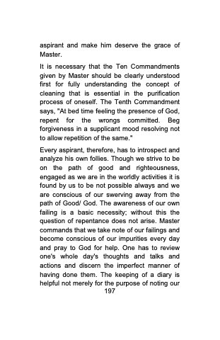 Every aspirant, therefore, has to introspect and analyze his own follies. Though we strive to be on the path of good and righteousness, engaged as we are in the worldly activities it is found by us to be not possible always and we are conscious of our swerving away from the path of Good/ God. The awareness of our own failing is a basic necessity; without this the question of repentance does not arise. Master commands that we take note of our failings and become conscious of our impurities every day and pray to God for help. One has to review one's whole day's thoughts and talks and actions and discern the imperfect manner of having done them. The keeping of a diary is