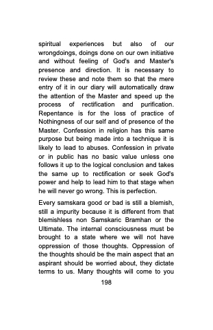 spiritual experiences but also of our wrongdoings, doings done on our own initiative and without feeling of God's and Master's presence and direction. It is necessary to review these and note them so that the mere entry of it in our diary will automatically draw the attention of the Master and speed up the process of rectification and purification. Repentance is for the loss of practice of Nothingness of our self and of presence of the Master. Confession in religion has this same purpose but being made into a technique it is likely to lead to abuses. Confession in private or in public has no basic value unless one follows it up to the logical conclusion and takes the same up to rectification or seek God's power and help to lead him to that stage when he will never go wrong. This is perfection.