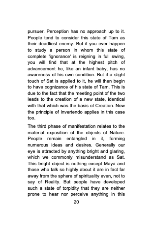 pursuer. Perception has no approach up to it. People tend to consider this state of Tam as their deadliest enemy. But if you ever happen to study a person in whom this state of complete 'ignorance' is reigning in full swing, you will find that at the highest pitch of advancement he, like an infant baby, has no awareness of his own condition. But if a slight touch of Sat is applied to it, he will then begin to have cognizance of his state of Tam. This is due to the fact that the meeting point of the two leads to the creation of a new state, identical with that which was the basis of Creation. Now the principle of Invertendo applies in this case too.