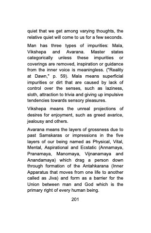 Man has three types of impurities: Mala, Vikshepa and Avarana. Master states categorically unless these impurities or coverings are removed, inspiration or guidance from the inner voice is meaningless. ("Reality at Dawn," p. 59). Mala means superficial impurities or dirt that are caused by lack of control over the senses, such as laziness, sloth, attraction to trivia and giving up impulsive tendencies towards sensory pleasures.