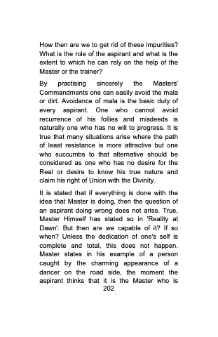 By practising sincerely the Masters' Commandments one can easily avoid the mala or dirt. Avoidance of mala is the basic duty of every aspirant. One who cannot avoid recurrence of his follies and misdeeds is naturally one who has no will to progress. It is true that many situations arise where the path of least resistance is more attractive but one who succumbs to that alternative should be considered as one who has no desire for the Real or desire to know his true nature and claim his right of Union with the Divinity.