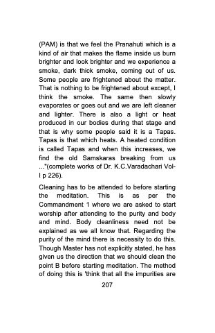 (PAM) is that we feel the Pranahuti which is a kind of air that makes the flame inside us burn brighter and look brighter and we experience a smoke, dark thick smoke, coming out of us. Some people are frightened about the matter. That is nothing to be frightened about except, I think the smoke. The same then slowly evaporates or goes out and we are left cleaner and lighter. There is also a light or heat produced in our bodies during that stage and that is why some people said it is a Tapas. Tapas is that which heats. A heated condition is called Tapas and when this increases, we find the old Samskaras breaking from us ..."(complete works of Dr. K.C.Varadachari Vol- I p 226).