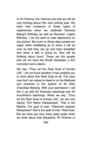 We say, "Thou art the Real Goal of Human Life". I do not know whether it has enabled you to think about this Real Goal at all. The topic now that I am asked to dwell is on the Methods and practices in the system of Sri Ram Chandraji Maharaj. With your permission I will link it up with Sri Krishna's teachings and Sri Aurobindo's teachings. When we say, "Thou art the Real Goal of Human Life", we are only saying "Om Namo Narayanaya", That is the Mantra. The goal of man -"Naranam ayanam Narayanam" that is the goal of man. Real Goal. But we have got very many petty goals when we think about that Narayana, Sri Krishna or