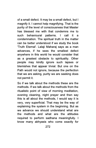 of a small defect. It may be a small defect, but I magnify it. I cannot help magnifying. That is the purity of the level of consciousness that Master has blessed me with that condemns me to such behavioural patterns. I call it a condemnation. The spiritual truth in the matter can be better understood if we study the book 'Truth Eternal'. Lalaji Maharaj says as a man advances, if he sees the smallest defect anywhere in this world he would consider that as a greatest obstacle to spirituality. Other people may kindly ignore such lapses or blemishes that appear trivial. But one on the Path would not ignore, because the perfection that we are asking, purity we are seeking does not permit it.