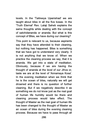 levels. In the 'Taitreeya Upanishad' we are taught about bliss in all the five kosas. In the 'Truth Eternal' Rev. Lalaji Saheb explains the same thoughts while dealing with the concept of satchidananda or ananda. But what is this concept of Bliss, we have during our cleaning?