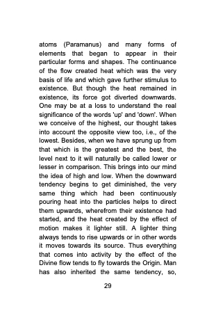 atoms (Paramanus) and many forms of elements that began to appear in their particular forms and shapes. The continuance of the flow created heat which was the very basis of life and which gave further stimulus to existence. But though the heat remained in existence, its force got diverted downwards. One may be at a loss to understand the real significance of the words 'up' and 'down'. When we conceive of the highest, our thought takes into account the opposite view too, i.e., of the lowest. Besides, when we have sprung up from that which is the greatest and the best, the level next to it will naturally be called lower or lesser in comparison. This brings into our mind the idea of high and low. When the downward tendency begins to get diminished, the very same thing which had been continuously pouring heat into the particles helps to direct them upwards, wherefrom their existence had started, and the heat created by the effect of motion makes it lighter still. A lighter thing always tends to rise upwards or in other words it moves towards its source. Thus everything that comes into activity by the effect of the Divine flow tends to fly towards the Origin. Man has also inherited the same tendency, so,