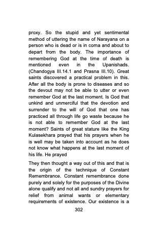 proxy. So the stupid and yet sentimental method of uttering the name of Narayana on a person who is dead or is in coma and about to depart from the body. The importance of remembering God at the time of death is mentioned even in the Upanishads. (Chandogya III.14.1 and Prasna III.10). Great saints discovered a practical problem in this. After all the body is prone to diseases and so the devout may not be able to utter or even remember God at the last moment. Is God that unkind and unmerciful that the devotion and surrender to the will of God that one has practiced all through life go waste because he is not able to remember God at the last moment? Saints of great stature like the King Kulasekhara prayed that his prayers when he is well may be taken into account as he does not know what happens at the last moment of his life. He prayed